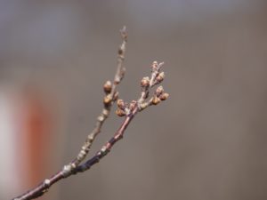 ≪2025年3月26日:つぼみ≫ 枝全体につぶつぶ感が出てきて、つぼみの色も薄緑に変化してきました。