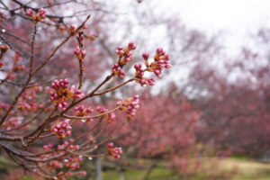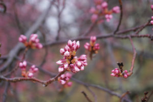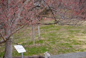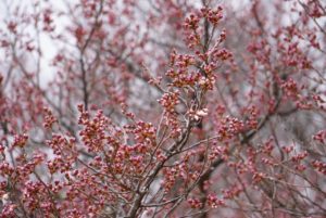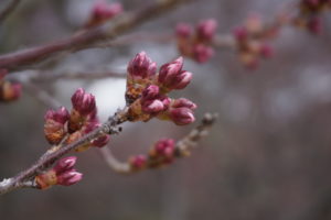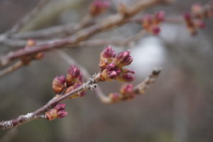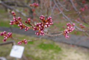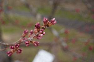 ≪2025年4月2日:つぼみのピンク色鮮やかに≫ 昨日より暖かに感じる城址公園内 春の雨につぼみのピンク色が鮮やかになってきています *南口標本木